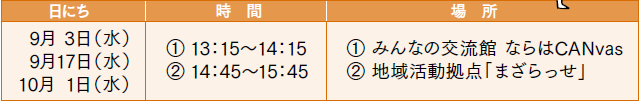 日時:9月10日(水)・9月24日(水)・10月8日(水)13:30~15:00