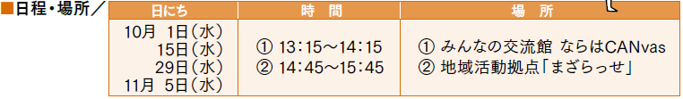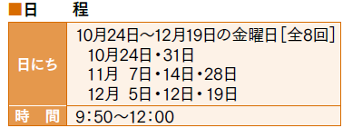 日時:10月8日(水)・10月22日(水)・11月12日(水)13:30~15:00