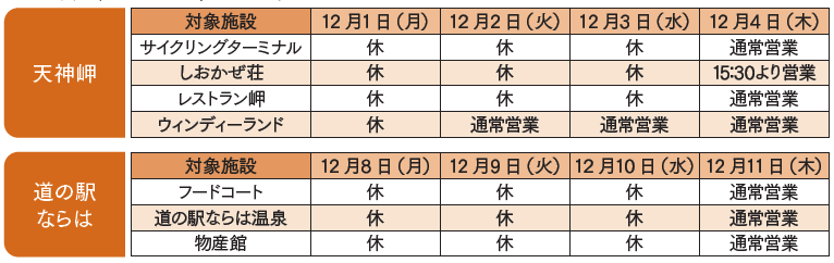 ◆「天神岬温泉しおかぜ荘・サイクリングターミナル・道の駅ならは」休館のお知らせ