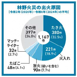 山火事を始めとする林野火災の出火原因の多くは、人的要因によるものです。特に2月から5月は、枯れた草や葉を焼却するための「たき火」や、害虫駆除などを目的として草や木などを広く焼却する「火入れ」が行われるなど、火を扱う機会が増えますが、その際に消火が不十分であったり、強風下などの気象条件で火を扱ったりすることなどが原因です。ほかにも、たばこなど火の不始末により山火事が発生しているケースもあるので、山火事に対する防火意識を高めることが重要です。