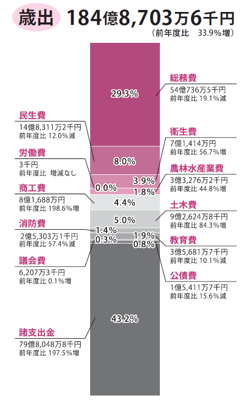 令和6年度の一般会計の決算額は、歳入総額196億5,237万円(前年度比25.5%増)、歳出総額184億8,703万6千円(前年度比33.9%増)となりました。