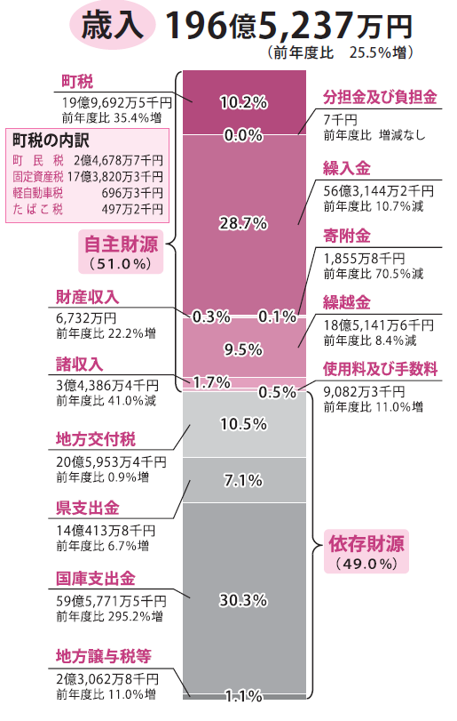 ・自主財源…町税や手数料など、町が自らの収入とすることができる財源