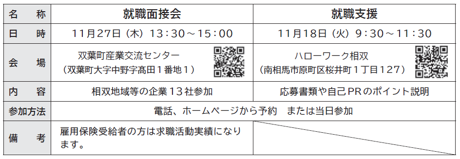 申込書と実施要項は町ホームページからダウンロード(二次元コードは本紙掲載)または双葉町教育委員会生涯学習課、各支所に準備しています。