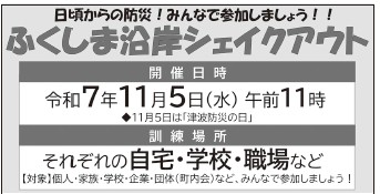 くらし ふくしま沿岸シェイクアウト 10/19 前の記事 次の記事 発行日 : 2025年10月20日 自治体名 : 福島県新地町 広報紙名 : 広報しんち 令和7年10月20日号 訓練内容:身を守る行動を実施しよう! (1)まず低く (2)頭をまもり (3)動かない (4)避難場所・避難経路の確認 問い合わせ:福島県防災対策課 【電話】024-521-7194 Tweet シェアする 好評発売中!『2026 福島県民手帳』 無料調停相談会