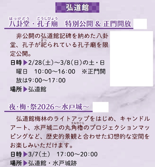 イベント 第130回記念 水戸の梅まつり 7/28 前の記事 次の記事 発行日 : 2026年02月01日 自治体名 : 茨城県水戸市 広報紙名 : 広報みと 令和8年2月1日号 2/11(水)~3/22(日) Tweet シェアする 3か年実施計画(2026年度~2028年度)を策定しました(3) 水戸産の梅「ふくゆい」