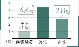 喫煙者と非喫煙者を比べると、男性は約4.4倍、女性は約2.8倍、肺がんを患うリスクが高くなっています。