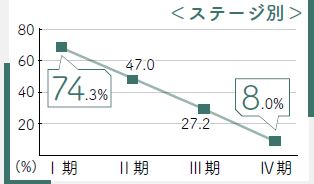 肺がんと診断された5年後の生存率は、発見が遅れるにつれてどんどん低下していき、ステージが進んだIV期になるまで発見が遅れると、生存率は1割を下回ります。