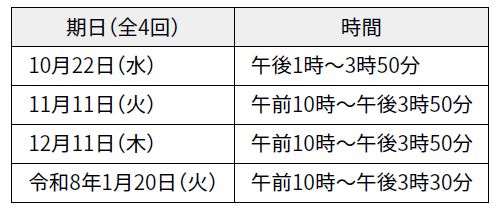 日時:10/7・21、11/4・11・18、12/2・9・16(火) 14:00~16:00