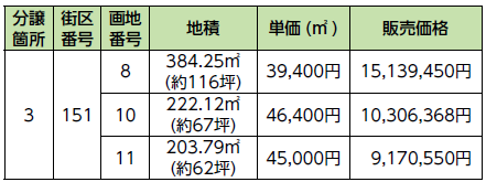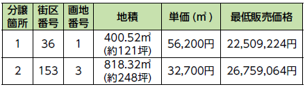 販売方法:一般競争入札(2区画)、公開抽選(3区画)