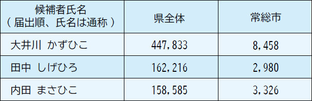 任期満了に伴う、茨城県知事選挙は9月7日に投票が行われ、即日開票の結果、大井川和彦氏(61歳無所属)が当選しました。当市の投開票結果は次のとおりです。