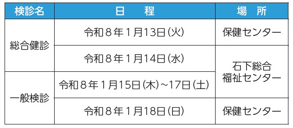 内容:プレメタボ健診、特定健康診査、後期高齢者医療制度健診、成人病検診、胃がん検診(総合検診のみ)、大腸がん検診、胸部レントゲン検査、前立腺がん検診、肝炎ウイルス検診