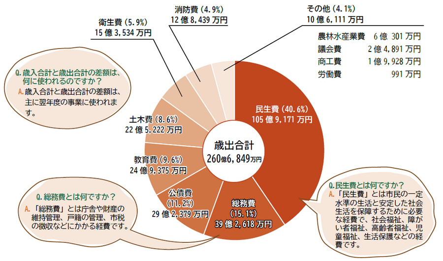 決算額の主な増加の要因としては、定額減税(調整給付を含む)や非課税世帯および住民税均等割世帯への物価高騰対策給付により、歳入面では地方特例交付金が2億6,857万円の増加(413.3%増)、歳出面では民生費が8億108万円の増加(8.2%増)となりました。