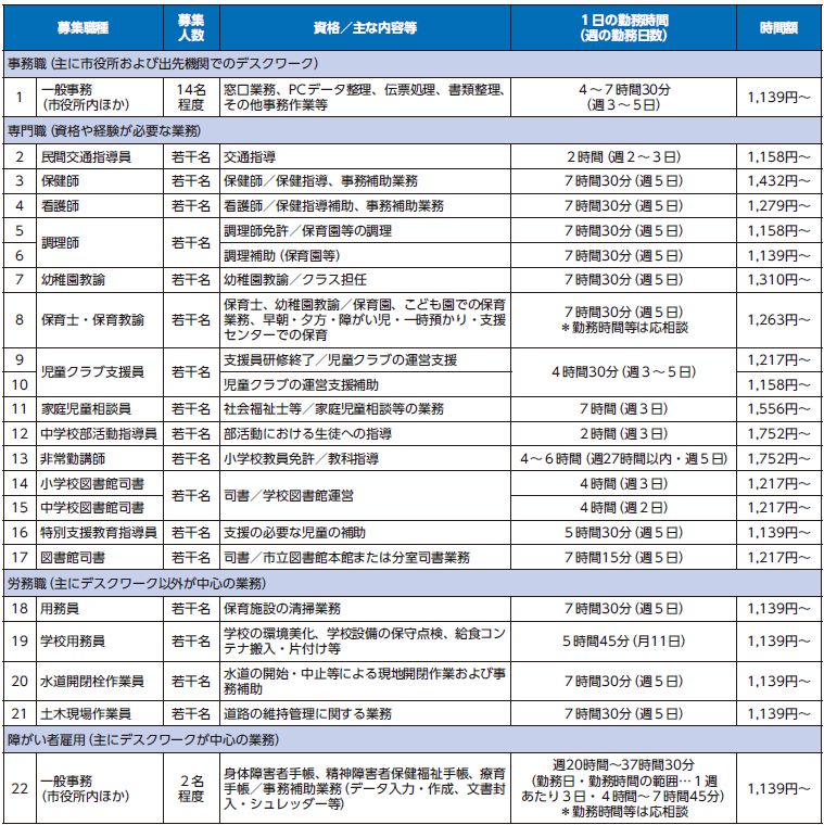 市では、業務の繁忙状況等を踏まえながら、次の職種について募集を行います。令和7年度に採用された方でも、年度途中で退職した方は改めて応募が必要です。