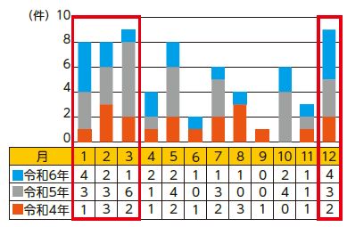 市内の過去3カ年における12月~3月の4カ月間で約5割の火災が発生しています。出火原因としては、たき火等の不始末による出火が多く発生しています。山火事を起こしたり建物に燃え移ることもあります。火の取り扱いには、十分注意してください。