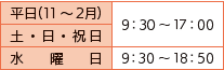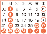 休館日は色塗り。○印の毎週土曜日は、小さなお子さん連れの人も気兼ねなく利用できるファミリータイム(10:00~12:00)。