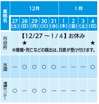 くらし 年末年始の業務案内 35/36 前の記事 次の記事 発行日 : 2025年12月05日 自治体名 : 茨城県高萩市 広報紙名 : 市報たかはぎ 令和7年12月号 ★日曜:サービスコーナー(本紙 P19) ※清掃センター(9:00~12:00・13:00~16:30) Tweet シェアする 来月号以降もとじ穴を廃止します その他のお知らせ(市報たかはぎ 令和7年12月号)