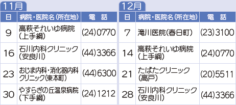 小児以外の二次救急医療機関(県北医療センター高萩協同病院)【電話】23-1122(代表)