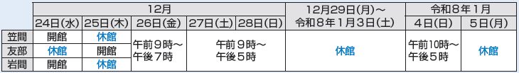 年末年始は下表のとおりとなります。休館にともない、12月16日(火)~28日(日)の貸出は、期間を3週間に延長します。