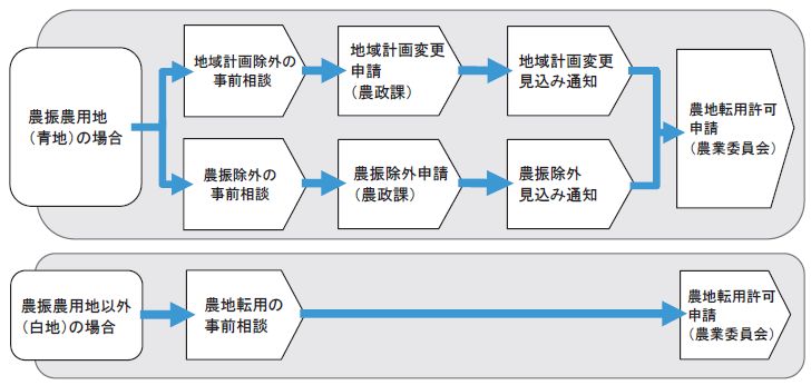 ・農振農用地区域(青地)の場合→地域計画の変更(除外)と農振除外を要する農地転用まで最短7か月程度