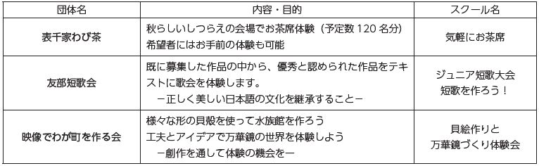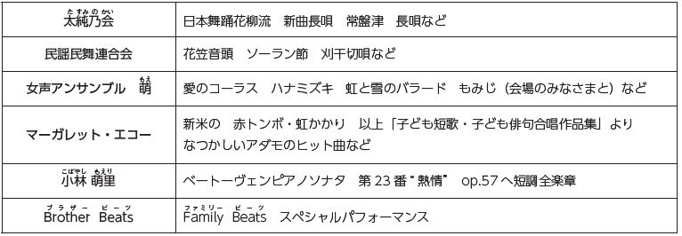 午前は体験スクールを、午後は日舞・民謡・合唱・ピアノ・マーチングドラムと多彩な舞台芸術鑑賞会を企画しました。
