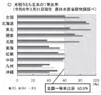 農林水産省の報告によると、地球温暖化により米の白未熟粒の発生などの影響が見られ、下図のとおり全国の一等米比率は減少傾向です。地球温暖化防止には地球規模の取り組みが必要ですが、私たち一人ひとりにも、日常生活を通じてできることがあります。その一つが「地産地消」です。