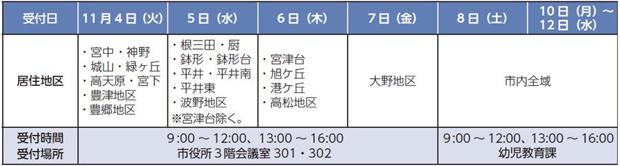 混雑緩和のため、地区ごとに受付日を指定します。下表をご覧ください。