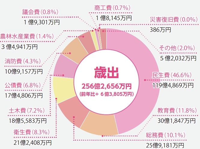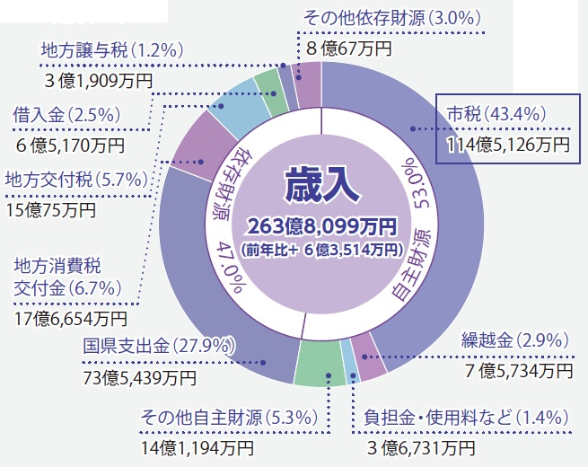 歳入は263億8,099万円、歳出は256億2,656万円、歳入歳出の差額は7億5,443万円です。