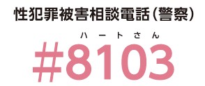 性犯罪の被害に遭われた方が相談しやすい環境を整備するため、各都道府県警察では、性犯罪被害相談電話につながる全国共通番号「【電話】#8103(ハートさん)」を運用しています。ダイヤルすると、発信された地域を管轄する各都道府県警察の性犯罪被害相談電話窓口につながります。