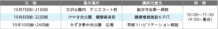 内容:屋外でできる運動の実演(健康器具など使用)、柔軟性を高めるストレッチ、継続できる運動方法の指導