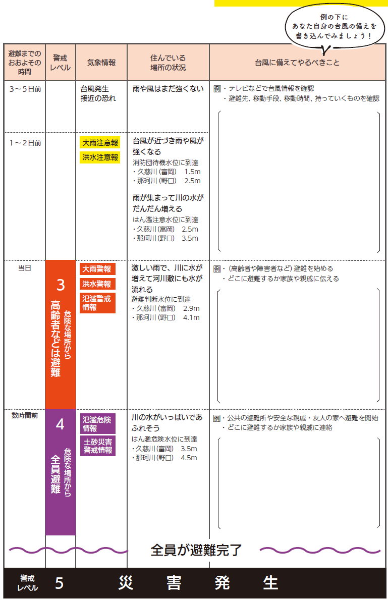 マイ・タイムラインとは、台風などの災害から自分を守るための避難行動計画です。災害がおこる前に作成しておきましょう。