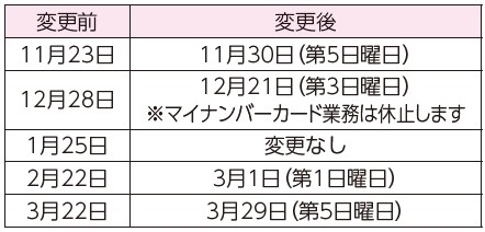 機器メンテナンスのため、11月から3月までの休日窓口の開設日を変更します。ご不便をおかけしますが、ご理解とご協力をお願いします。