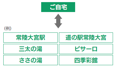 乗降場所は、ご自宅と市内の公共施設や商業施設、医療機関などの主要施設となります。