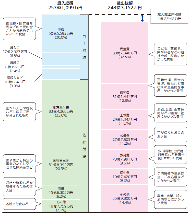 令和6年度の一般会計の決算は、歳入総額が253億1,099万円、歳出総額が248億3,152万円であり、歳入歳出差引額は4億7,947万円となりました。翌年度に繰り越すべき財源1億4,038万円を差し引いた実質収支は、3億3,909万円となりました。