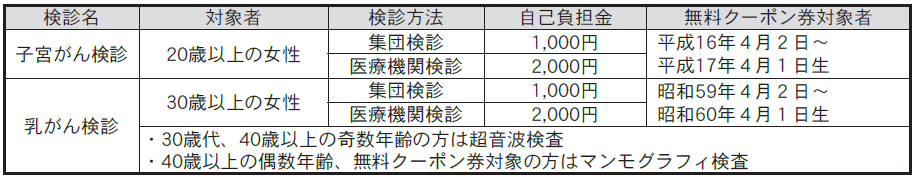 市では、子宮がん・乳がん検診の助成を行っています。1年(4月から3月の間)に1回、がん検診を受けましょう。