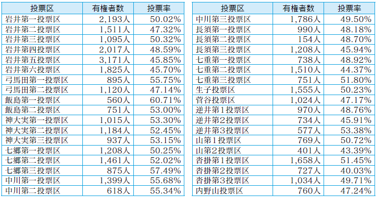 7月20日に行われた参議院議員通常選挙の市内投票率は、49・58%(選挙区)でした。開票結果は次のとおりです。