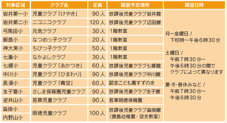 対象児童:保護者または同居の家族が仕事などの理由により、昼間家庭で保育をすることが困難な小学6年生までの児童