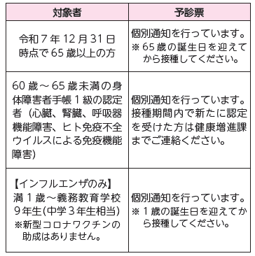 インフルエンザ・新型コロナ予防接種の一部助成を実施しています。対象となる方は次のとおりです。