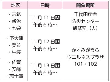 目指すべき将来の農地利用の姿を明確にするため、農業者の方や農地を保有している方などを対象とした座談会(年1回)を地区ごとに開催します。下記の日程で開催しますのでぜひご参加ください。