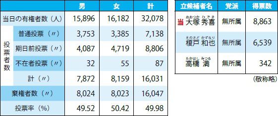 開票の結果、大塚 秀喜 氏が再選しました。
