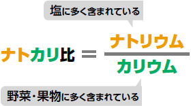ナトリウム(塩分)とカリウムの略で、高血圧予防のためにナトリウムを減らし、カリウムを多く摂る食生活を指します。食事から摂取したナトリウムとカリウムの大部分は尿に排泄されるため、尿検査による「ナトカリ比(ナトリウム/カリウム)」を測定することで、食事のバランス(塩分の過剰摂取やカリウム不足)を把握することができます。