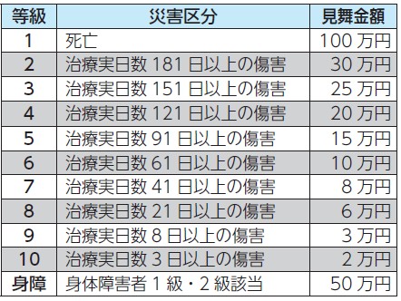 県民交通災害共済は、年一定額の会費を支払うと、加入者が交通事故でけがや死亡した場合、その度合いに応じて見舞金が給付される制度です。いざというときのために、ぜひ家族そろってご加入ください。