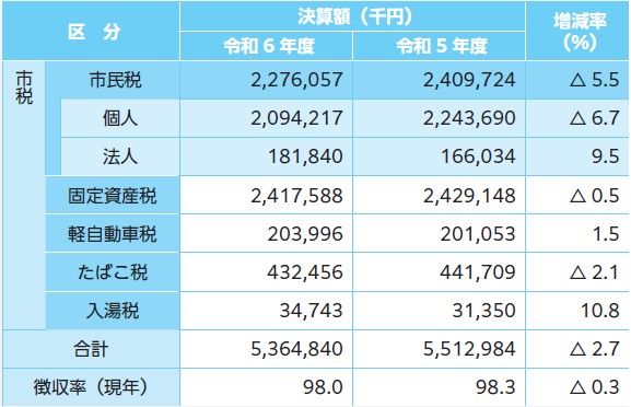 法人市民税や入湯税が増加しましたが、定額減税の実施により個人市民税が減少したため、前年度比1億4,814万4千円(△2.7%)の減となりました。