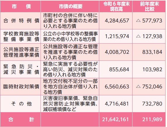 市債は「市の借金」です。財政上必要とする資金を外部から借り入れ、長期にわたり返済をすることで世代間の負担の均衡を図ります。