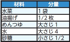(3).鍋に水菜、油揚げ、めんつゆ、水、砂糖を入れて火にかけ、混ぜながらさっと煮て器に盛る。