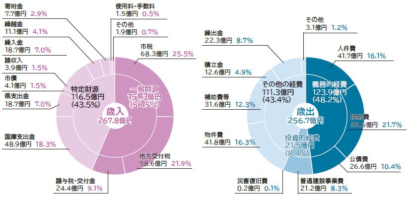 一般会計の歳入額は、267億8,000万円、歳出額は、256億7,000万円で翌年度に繰り越すべき財源2億8,000万円を除き、実質収支は、8億3,000万円の黒字となりました。