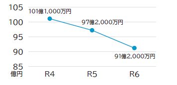 法律や条例に基づき設置される「基金」は、さまざまな目的のために積み立てた市の貯金です。令和6年度末の普通会計基金残高は91億2,000万円です。教育施設の解体や学校施設の整備費用等、商工観光事業などの地域振興事業に基金を活用したため、前年度末から6億円減少しています。