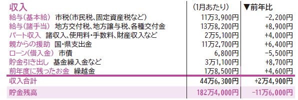 決算額を5,000分の1に縮小し、1か月分を算出して、市の財政状況を家計簿に見立てました。