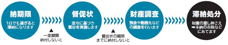 市税などは決められた期限内に自主的に納めていただくものです。未納のまま市税などを放置した場合、事前に知らせることなく法令に基づき預金・勤務先などの調査や財産の差し押さえを行います。
