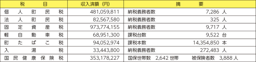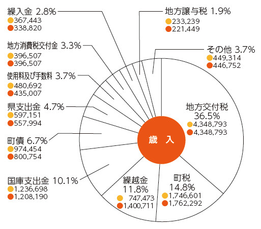 主な財源を前年度と比較すると、地方交付税が1億4,802万4千円(3.5%)、地方特例交付金が5,490万3千円(1,029.1%)、寄附金が3,074万6千円(53.5%)、地方譲与税が2,869万1千円(14.9%)、地方消費税交付金が1,960万4千円(5.2%)それぞれ増加し、国庫支出金が10億5,492万5千円(46.6%)、県支出金が5億2,506万5千円(48.5%)、繰越金が1億4,397万2千円(9.3%)、町債が1億1,784万6千円(12.8%)、繰入金が7,715万9千円(18.5%)それぞれ減少しています。歳入全体では、前年度と比較して17億135万円(12.5%)の減となりました。