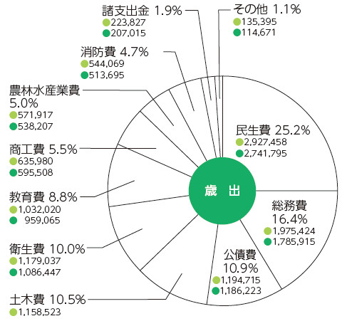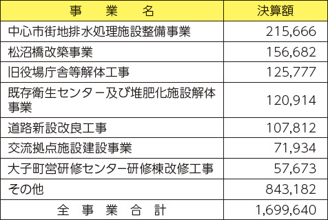 歳出については、行政改革大綱に基づいて経費の削減に努めながらも、中心市街地排水処理施設整備事業や松沼橋改築事業をはじめとして、誰もが安心・安全に暮らせるまちづくり、未来を担う心豊かな人を育むまちづくり、元気、にぎわい、活力ある産業を創造するまちづくり、地域の資源を紡ぎ町のストーリーとして発信するまちづくり、交流と協働による、魅力あふれ、健全で持続可能なまちづくりなど、重要かつ緊急度の高いものから各種事業を推進しました。歳出全体では、前年度と比較して13億5,064万5千円(11.1%)の減となりました。